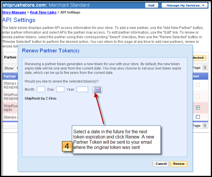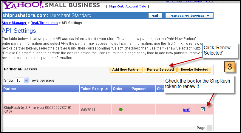 After the Yahoo Access Token is re-enabled, Yahoo Merchant Solutions Web Services will send an email acknowledging that the access token is renewed, and providing a new partner API access token. This new token must be updated in My.ShipRush.